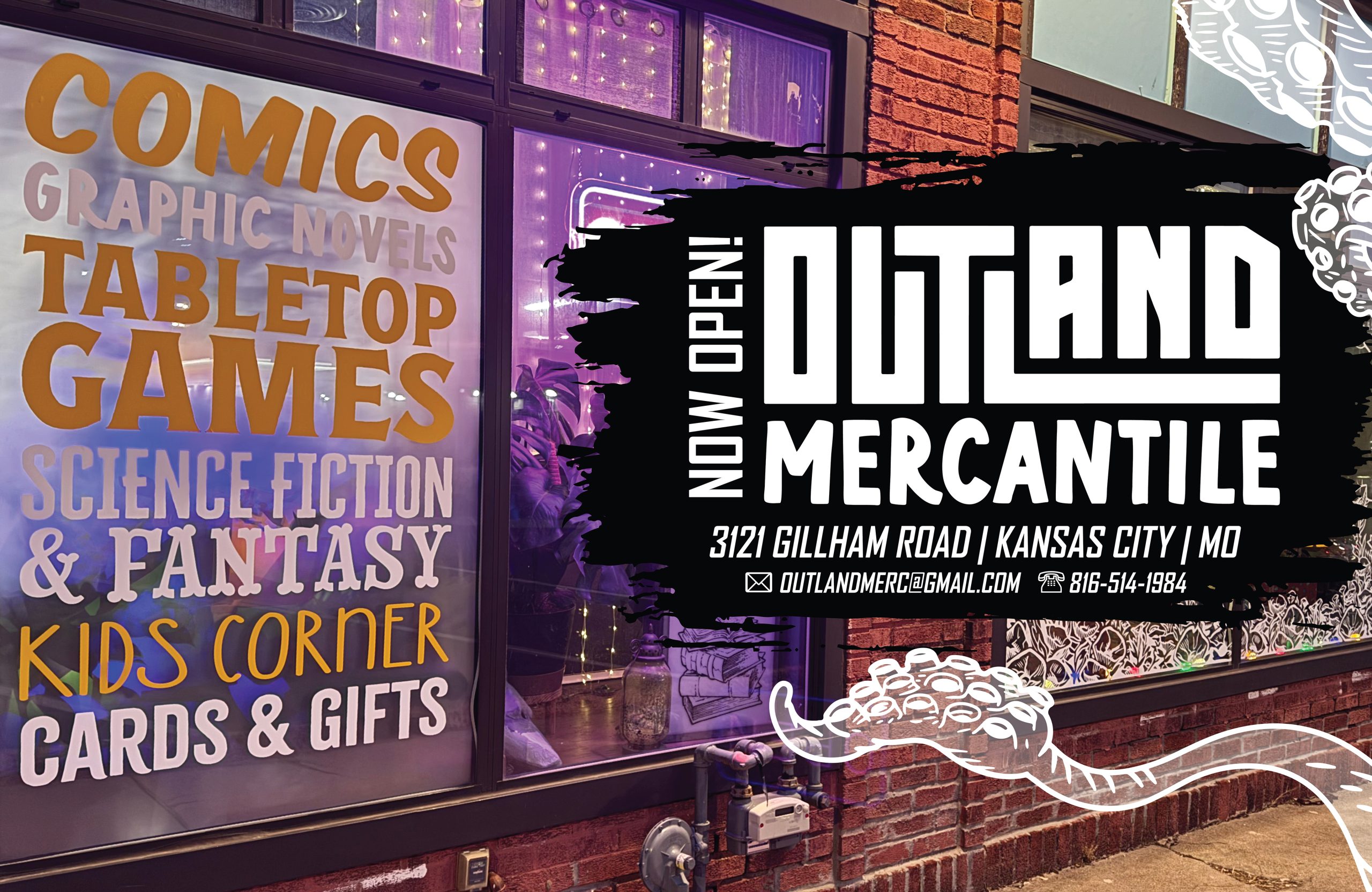 The Outland Mercantile is a vibrant comic, board game, and fiction hub in the heart of mid-town Kansas City, also featuring a charming letterpress shop. Offering a friendly atmosphere, workshops, game days, and special events.